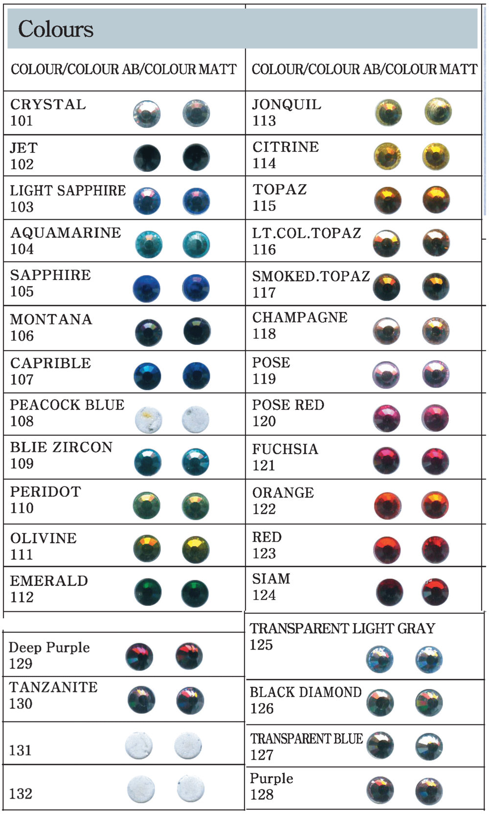 JONQUIL 113 CRYSTAL 101 CITRINE 114 JET 102 TOPAZ 115 LIGHT SAPPHIRE 103 COLOUR/COLOUR AB/cOLOUR MAT AQUAMARINE 104 LT.COL.TOPAZ 116 TRANSPARENT LIGHT GRAY 125 SMOKED.TOPAZ 117 SHAPPHIRE 105